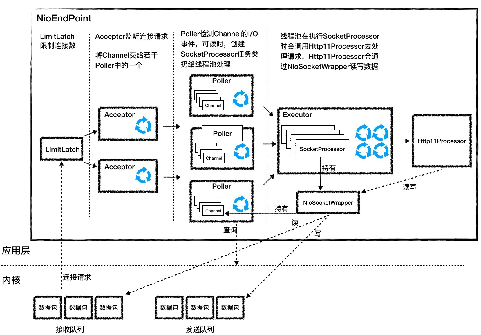 <font style="color:rgb(55, 53, 47);">Tomcat 的 NioEndpoint 组件实现了 I/O 多路复用模型,总体工作流程如下:</font>