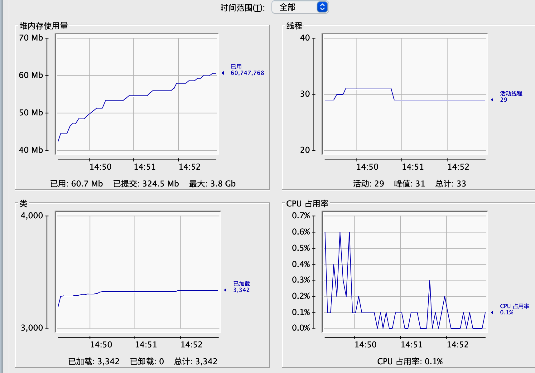 <font style="color:rgb(55, 53, 47);">吞吐量、响应时间、错误数在 MBeans 标签页下选择 GlobalRequestProcessor</font><font style="color:rgb(55, 53, 47);">,这里有 Tomcat 请求处理的统计信息。你会看到 Tomcat 中的各种连接器,展开“http-nio-8080”,你会看到这个连接器上的统计信息,其中 maxTime 表示最长的响应时间,processingTime 表示平均响应时间,requestCount 表示吞吐量,errorCount 就是错误数。</font>