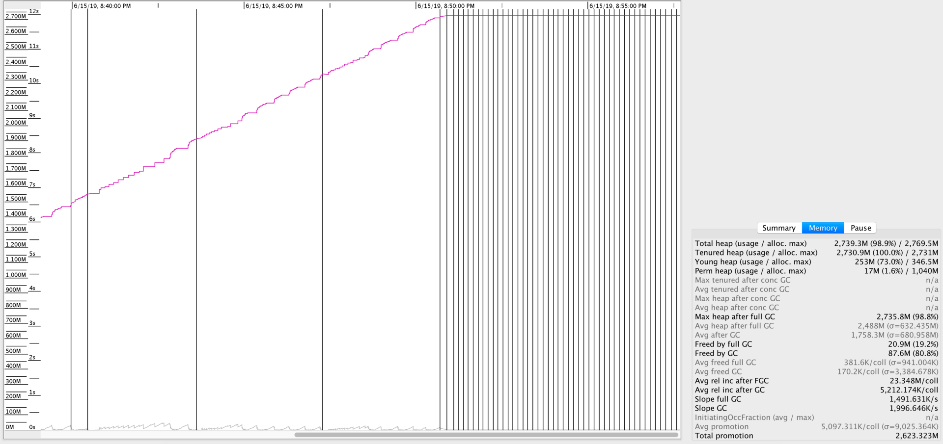 <font style="color:rgb(55, 53, 47);">图中红色的线表示年老代占用的内存,你会看到它一直在增加,而黑色的竖线表示一次 Full GC。你可以看到后期 JVM 在频繁地 Full GC,但是年老代的内存并没有降下来,这是典型的内存泄漏的特征。</font>